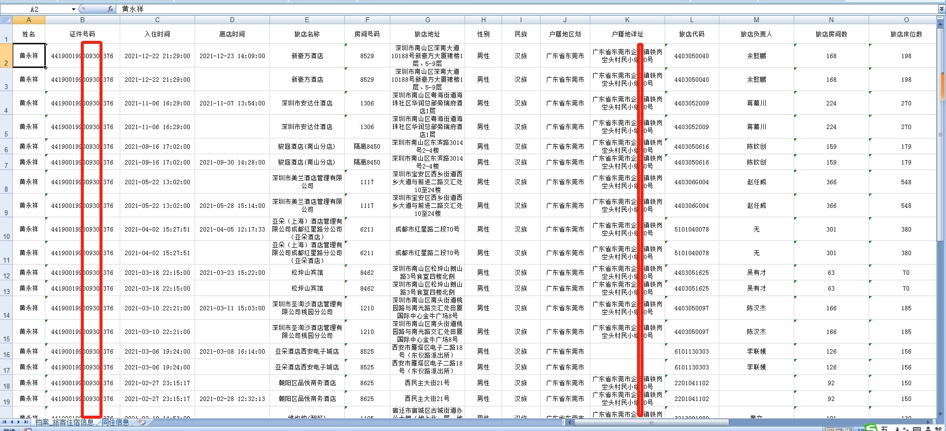 同住人的信息包括:姓名、性别、年龄、身份证号码、身份证地址、同住次数、文化程度、民族等。